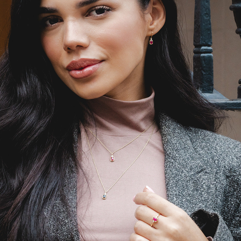 - Contemporary ruby pendants that bring a pop of colour to everyday outfits