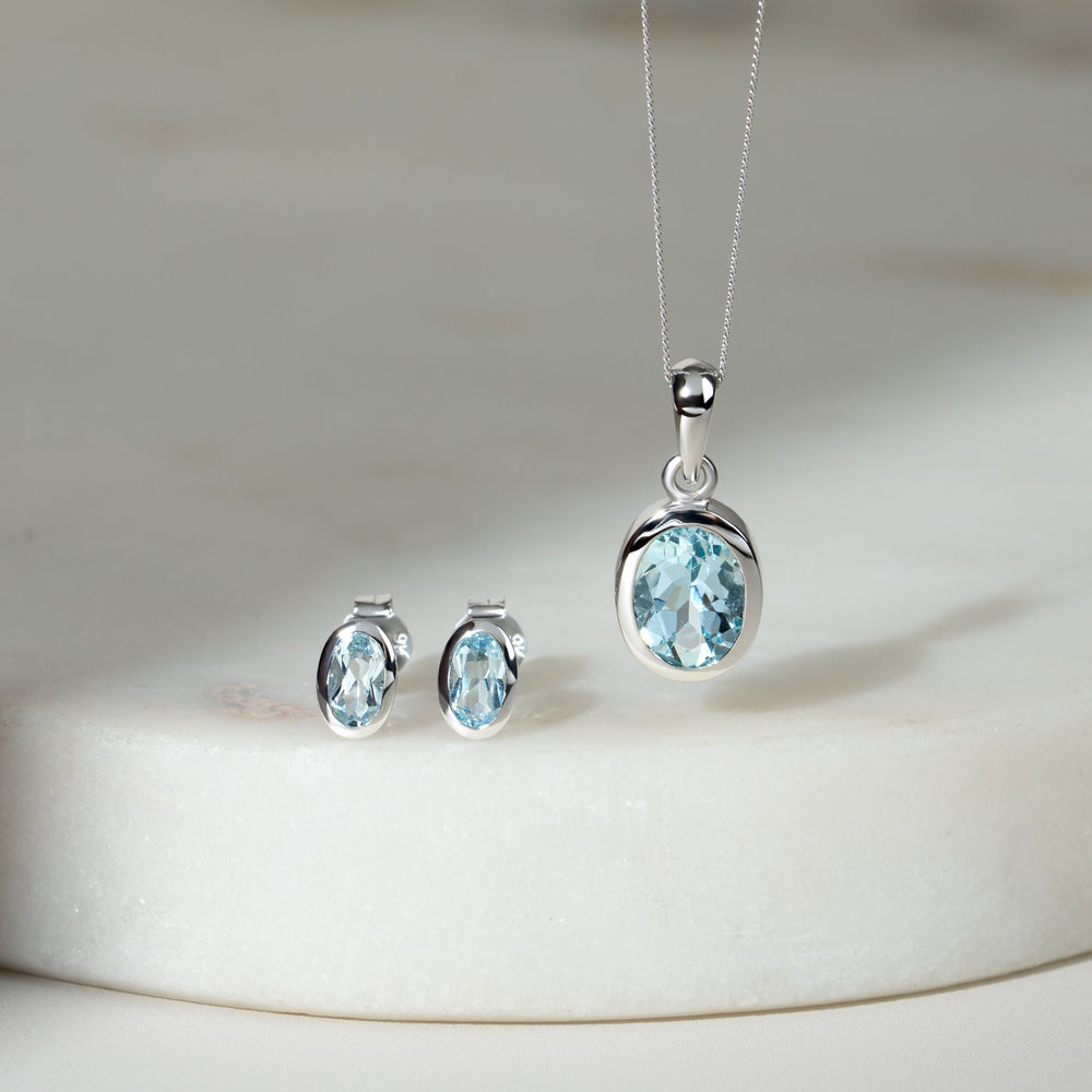 In Latin, the name aquamarine is translated as 'water of the sea' and it is easy to see why from the sparkle and clarity of this icy blue gem. It has been said that in ancient times, sailors would be kept safe on voyages at sea if an aquamarine was on board. Discover chic aquamarine jewellery in a mix of sterling silver and gold designs: rings, earrings, necklaces, pendants and jewellery sets more.