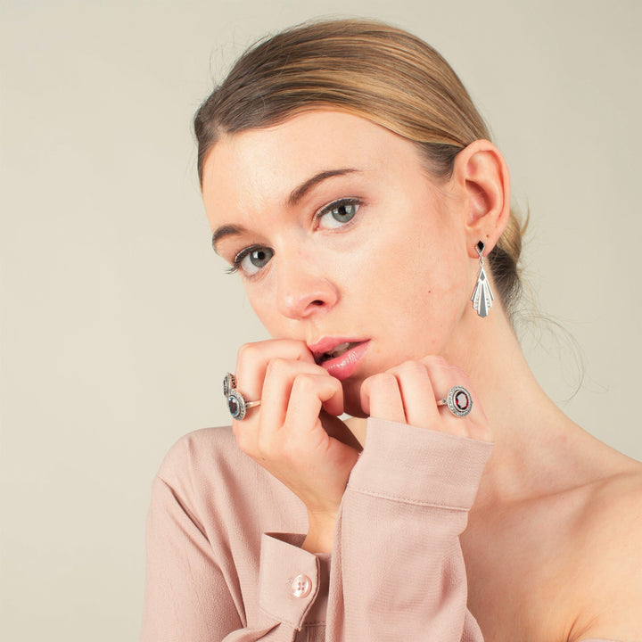A pair of stunning art deco style drop earrings crafted from sterling silver set with black onyx cabochons offset with sparkling marcasite gemstones to form an art deco fan design