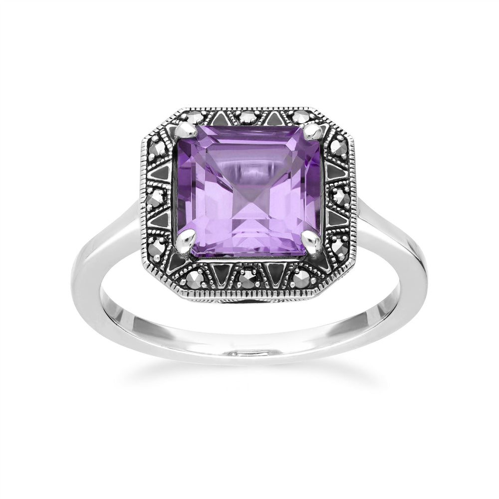 A beautiful square amethyst ring surrounded with sparkling marcasite for lovers of Art Deco jewellery design. Just perfect to make a statement or add to your sterling silver ring stack.