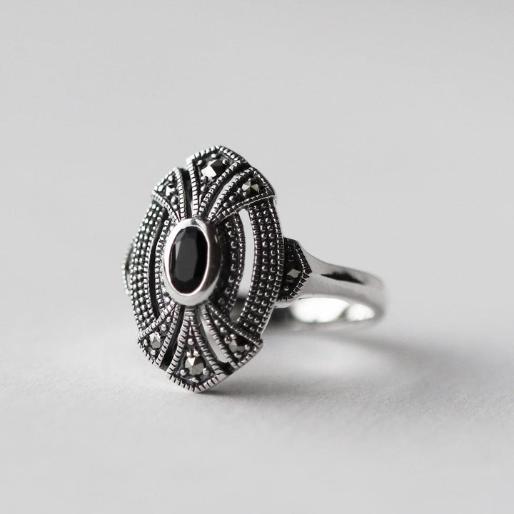 Art Deco Style Oval Black Onyx & Marcasite Cocktail Ring in 925 Sterling Silver