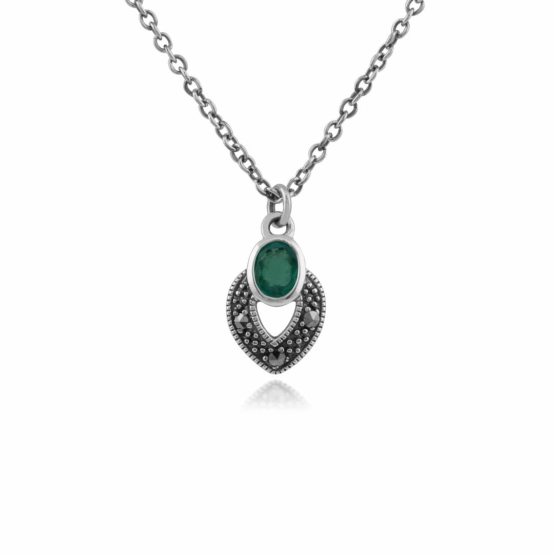 Art Deco Style Oval Emerald & Marcasite Necklace in 925 Sterling Silver - Gemondo