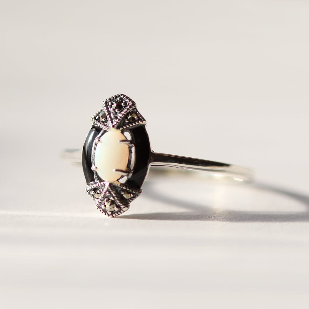 Art Deco Style Oval Opal, Marcasite & Black Enamel Marquise Ring In Sterling Silver