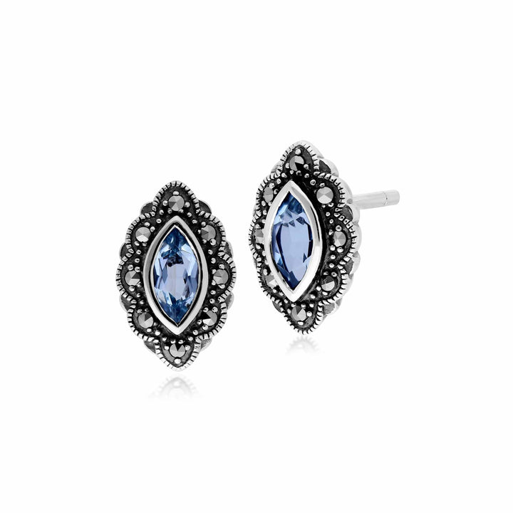 A beautiful pair of art nouveau style stud earrings crafted from sterling silver, featuring a central marquise faceted blue topaz gemstone, surrounded by sparkling marcasites.