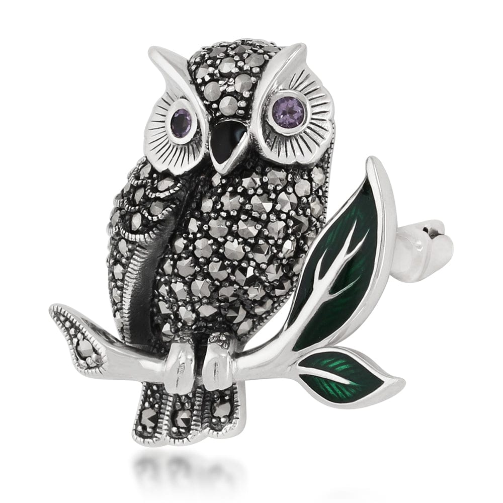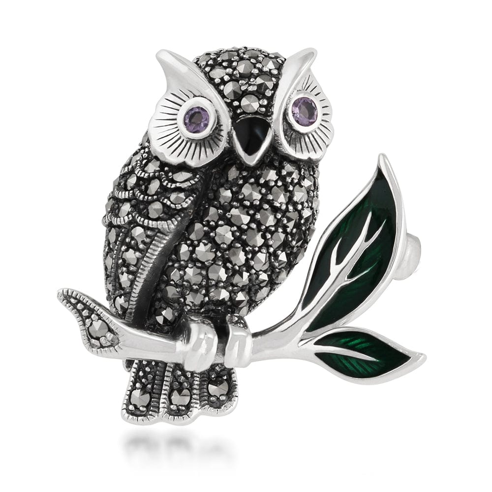 Art Nouveau Style Marcasite, Amethyst & Enamel Owl Brooch in  Sterling Silver - Gemondo