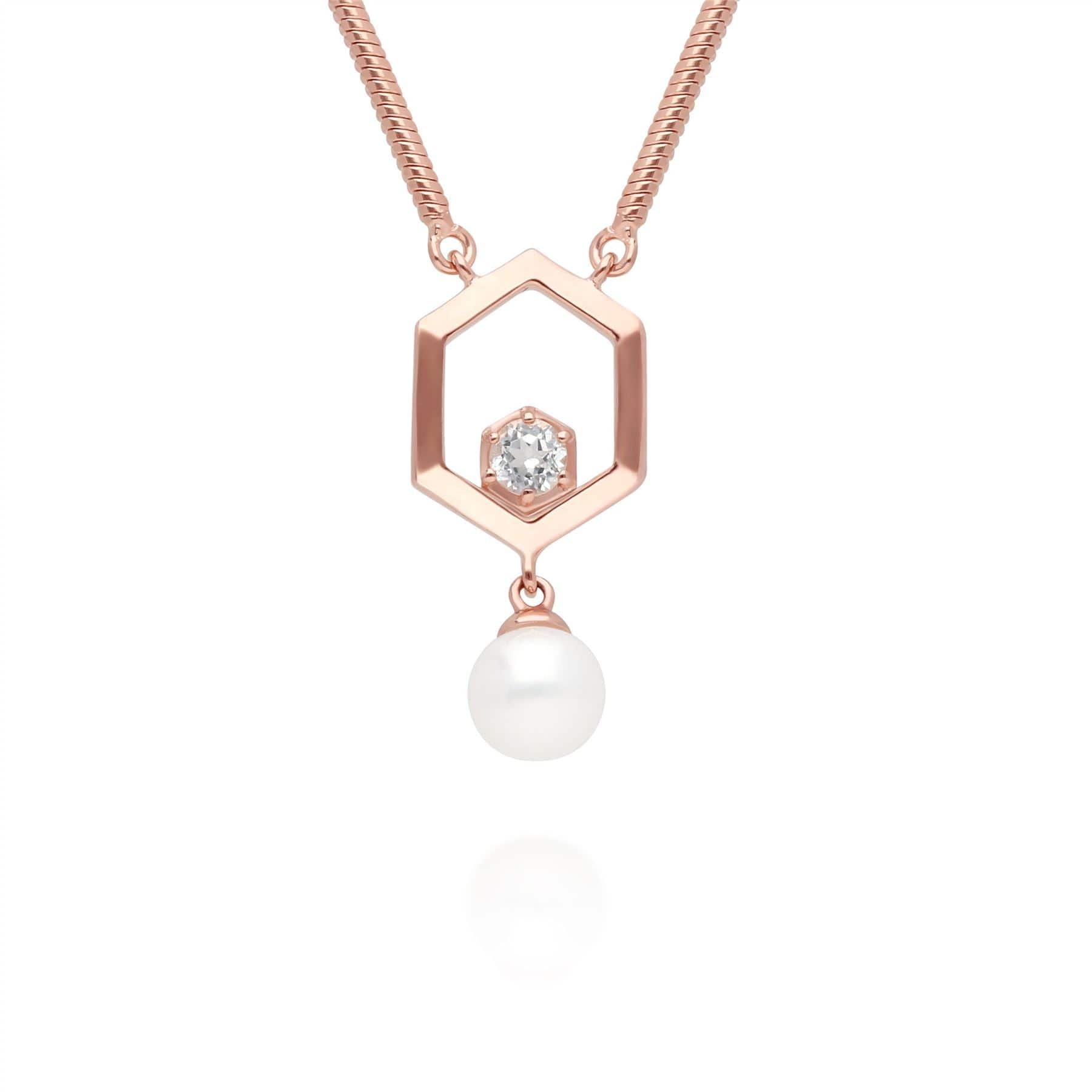 Modern Pearl & White Topaz Hexagon Drop Necklace in Rose Gold Plated Silver
