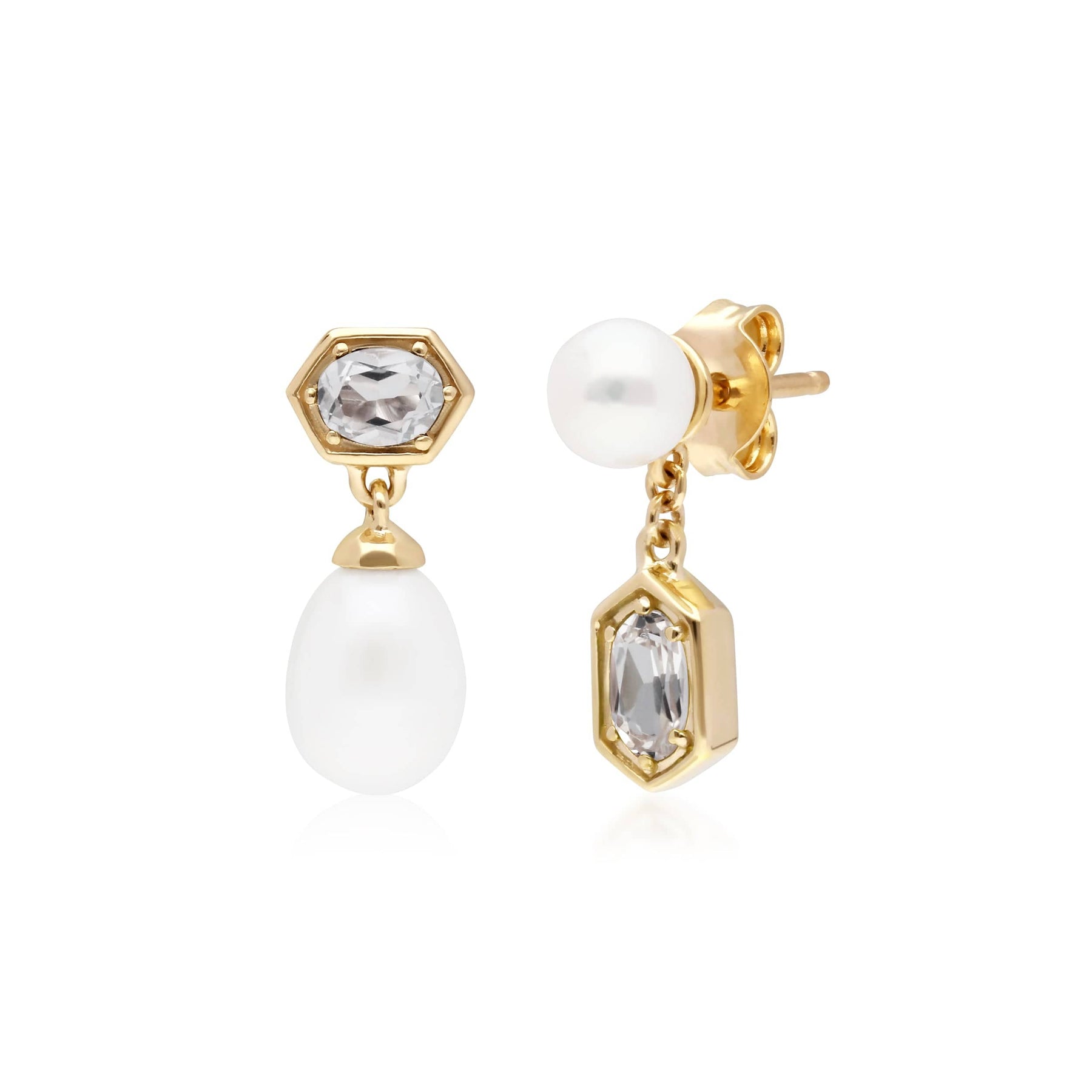 Modern Pearl & White Topaz Mismatched Drop Earrings in Gold Plated Silver